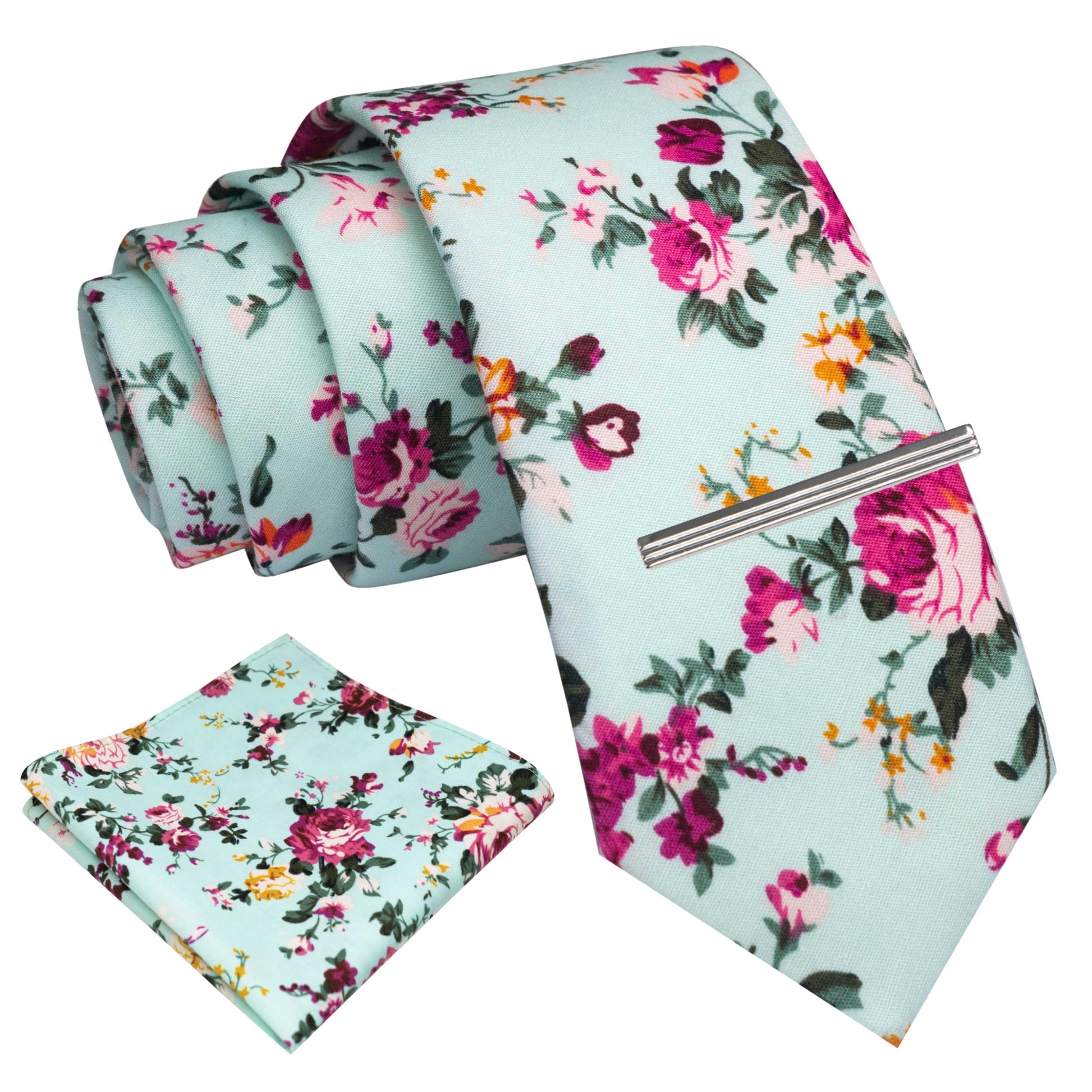 Cotton Floral Skinny Tie and Pocket Square With Tie Clip Set